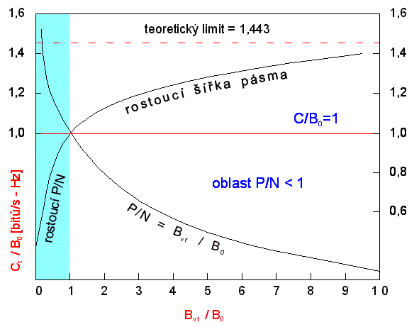 Z obr. 1 vyplývá, že při poklesu normované šířky pásma Bvf/Bo pod hodnotu 1 klesá velmi rychle i normovaná kapacita kanálu C/Bo. Avšak poměr signál/šum P/N se v popisované oblasti grafu při zmenšování šířky pásma rapidně zvětšuje. Uvažovaná oblast tedy zřejmě odpovídá "tradičním" komunikačním systémům, které pracují při poměrech signál/šum -mnohem větších než jedna a jsou typické relativně velkými vysílanými výkony P a malými šířkami pásma Bvf.