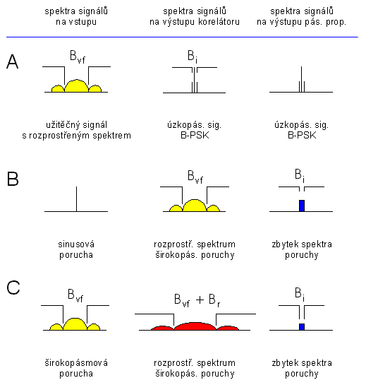 Přivádí-li se k přijímači uvažovaného typu určitý užitečný vstupní signál, dochází v korelátoru k jeho násobení se synchronním referenčním signálem, čímž se zužuje jeho pásmo z hodnoty Bvf na hodnotu Bi odpovídající šířce pásma následujícího pásmového filtru (viz obr. 8a). Přichází-li k přijímači navíc ještě intenzívní rušivý signál, o němž předpokládejme, že je čistě sinusový, bude v korelátoru v důsledku "asynchronního" násobení referenčním signálem jeho spektrum naopak rozšířeno, a to právě na hodnotu Bvf (obr. 8b); následující propust však z něho dále propustí opět jen úzký úsek Bi), takže na výstupu propusti je rušivý signál potlačen v poměru Bo / Bi, tj. v poměru systémového zisku Go. Je-li na vstupu přijímače přítomen širokopásmový rušivý signál, s šířkou pásma Br srovnatelnou s šířkou Bvf, a není-li korelován se signślem přijímaným (užitečným), bude korelátorem rovněž rozprostřen, a to do pásma (Bvf + Br). Zmíněné pásmo je ale širší než v případě úzkopásmového rušení a tudíž spektrální hustota širokopásmové poruchy bude menší než poruchy úzkopásmové. V důsledku toho se bude i po úzkopásmové filtraci širokopásmové rušení projevovat slaběji než úzkopásmové s bude tedy méně nebezpečná(ovšem při stejných rušivých výkonech v obou případech), obr. 8c.