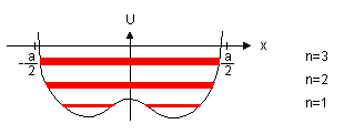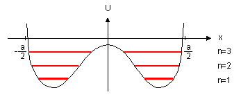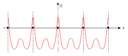 Pro zjednodušení situace si prostorové periodické uspořádání atomů v krystalu látky představujeme jen v jedné souřadnici - jednorozměrně. Musíte mi věřit, že i tento velmi zjednodušená představa vede k velmi solidnímu popisu dějů spojených s vodivostí v pevných látkách. V jednorozměrném přiblížení budou jádra atomů jednoduše rozmístěna periodicky po ose úseček (černé tečky) a na osu pořadnic vynášejme průběh potenciálu. Obr. 3.1.