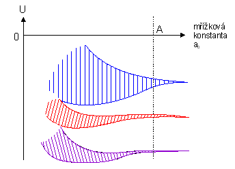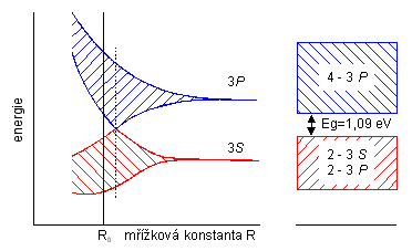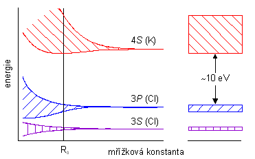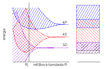 Jsou-li atomy osamocené, nebo dostatečně daleko od sebe, nepůsobí prakticky na sebe, elektrony jsou lokalizovány v blízkosti ”svých” jader a jejich energie jsou diskrétní hladiny, obdobně, jako to pro atom vodíku budete počítat v kvantové mechanice, viz obr. 3.2a. Přibližujeme-li atomy k sobě, ruší se částečně coulombické přitažlivé síly a elektrony přestávají být lokalizovány, viz obr. 3.2b. Tento efekt vzrůstá s dalším přibližováním atomů a stále více a více elektronů přestává být lokalizováno ke svým původním jádrům. Přitom dochází k ”rozmazání” diskrétních energetických hladin na pásy, což je důsledek tzv. Pauliho vylučovacího principu, který říká, že nemohou existovat dva elektrony ve stejném kvantovém stavu. Pokud je atom osamocený, nastává tzv. degenerace energetických hladin, tj. situace, kdy několik elektronů v různých kvantových stavech obsazuje energetickou hladinu o téže energii. Působením vnějšího pole (v našem případě coulombickou interakcí ostatních jader) se degenerace tzv. snímá a energetické hladiny se štěpí na tolik podhladin, aby každému stavu elektronu příslušela (o něco málo) různá energie. Velikost rozštěpení hladin je závislé na intenzitě vnějšího pole a tedy na vzdálenosti atomů od sebe. Můžeme si tedy velmi schematicky tento efekt znázornit tak, jak je uvedeno na obr. 3.3. Na ose x je vzdálenost atomů od sebe v mřížce, na ose y energie. Provedením ”řezu” přes rozštěpené energetické hladiny pro x rovné (lineární) mřížkové konstantě získáme tzv. energetický pásový diagram tak, jak jej budeme pro náš výklad v dalším používat. Vidíme, že energetické pásy (intervaly) energií, které mohou elektrony nabývat (vyšrafované), mohou být odděleny tzv. pásy zakázaných energií, zakázanými pásy.