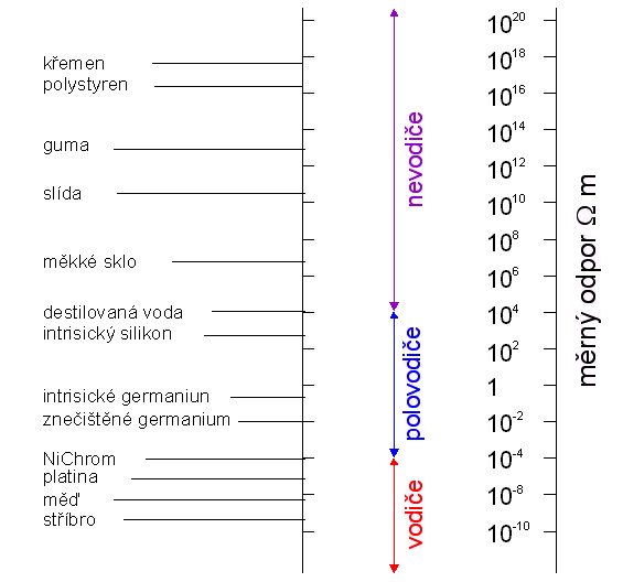 Na základě těchto znalostí již můžeme kvalitativně vysvětlit velmi rozdílnou elektrickou vodivost látek tak, jak je uvedena při pokojové teplotě v tabulce 3.1. Vidíme, že rozsah měrných odporů látek zahrnuje hodnoty od cca 1018 W.m u křemene až do hodnoty cca 10-9 W.m u stříbra, tedy 27 řádů. Uvědomíme-li si, že vodivost látky je úměrná koncentraci volných nosičů náboje a fakt, že tato koncentrace závisí exponenciálně na šířce zakázaného pásu, je kvalitativní vysvětlení nasnadě. Změna šířky zakázaného pásu o pouhých 56 meV způsobí e @ 3.7 násobnou změnu této koncentrace, zvětšení šířky zakázaného pásu o 1 eV způsobí zmenšení koncentrace nosičů danou faktorem 4.10-9. Je tedy zřejmé, že hlavní charakteristickou veličinou, která bude rozdělovat pevné látky na vodiče, polovodiče a izolanty, bude šířka zakázaného pásu.