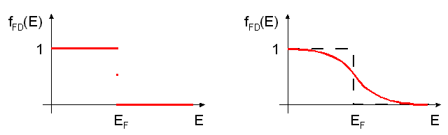Uvažme, jak se může ”pravoúhlý” charakter našeho rozdělení energií změnit při zahřátí látky. Z názoru plyne (někdy je názor zavádějící, ale nikoliv v tomto případě), že zahřátí látky neovlivní nikterak podstatně elektrony obsazující nejnižší energetické hladiny; aby tyto elektrony mohly ”přijmout” tepelnou energii, musely by mít možnost přejít na vyšší energetickou hladinu, tuto možnost ale nemají, neboť hladiny ”nad nimi” jsou obsazeny. Proto bude energetické rozdělení elektronů zahřátím modifikováno jen málo a bude se jednat v podstatě o zaoblení ”rohů” původně ”pravoúhlého” rozdělení. Určitou představu již tedy máme, a proto teď uvedu vzorec pro energetické rozdělení elektronů, obecněji pro nerozlišitelné částice s poločíselným spinem, tzv. Fermi-Diracovo rozdělení. Je dáno vztahem: