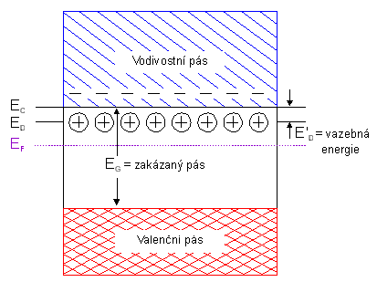 Při popisu příměsových polovodičů pomocí pásových diagramů je výhodné zavést pojem tzv. příměsových hladin, tj. energetických úrovní odpovídajících hladinám příměsí. Jestliže např. je zapotřebí energie Ed’ k tomu, abychom ”utrhli” elektron od atomu příměsi (tato energie je daná jen kombinací polovodič-příměs), pak tzv. donorová hladina bude ležet o Ed’ pod spodní hranicí vodivostního pásu a podobně potřebujeme-li dodat energii Ep’, abychom ”nalepili” elektron na akceptorový atom (tj. vytvořili díru ve valenčním pásu), bude tzv. akceptorová hladina ležet o Ep’ nad horní hranicí valenčního pásu. V dalším budeme uvažovat polovodič s koncentrací donorů Nd a koncentrací akceptorů Na tak, že např. se bude jednat o polovodič typu n, tj. Nd » Na. Energie Ed’ a Ea’ jsou pro křemík řádu 50 meV, tedy velmi srovnatelné s tepelnou energií elektronů při pokojové teplotě (cca 28 meV). Většina donorů i akceptorů bude pak tepelně ionizována, budou však existovat neionizované (neutrální) zbytky, jejichž koncentraci označíme po řadě Ndn a Nan. Podle zákona zachování náboje musí celkový náboj v látce zůstat nulový, tedy i v jednotce objemu, tj.