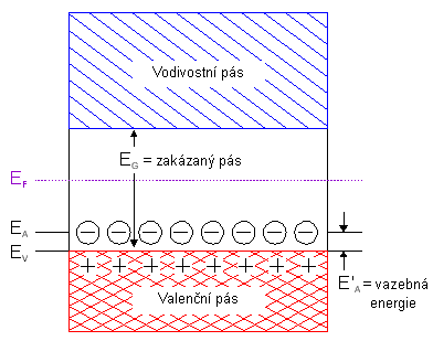 Naprosto stejnou úvahu a výpočet můžeme provést pro dotaci příměsemi typu p. V polovodiči nepříliš dotovaném příměsemi typu p bude tedy Fermiho hladina ležet mezi středem zakázaného pásu a akceptorovou hladinou. Pásové diagramy pro oba případy vidíme na obr.3.10 pro polovodič typu n a na obr. 3.11 pro polovodič typu p.