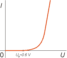 kde V je napětí na přechodu (kladné v propustném směru) a Io tzv. zbytkový proud. Při odvozování této rovnice je třeba předpokládat, že veškeré z vnějšku přiložené napětí se objeví na přechodu, jinak řečeno, že proudy v propustném směru budou tak malé, aby nezpůsobily ohmické úbytky při průchodu proudu polovodičem od kontaktu k přechodu. Zhruba se dá říci, že to je splněno pro proudy až do cca 1 mA a v tomto rozmezí proudů může tedy dioda sloužit jako prvek s exponenciální voltampérovou charakteristikou. Pro vyšší proudy pak ohmické úbytky převáží, uvedená diodová rovnice přestává platit a je nahrazena prostým Ohmovým zákonem, kde v roli odporu vystupuje odpor materiálu diody (představíme-li si odpor materiálu diody a odpor přechodu jako dva odpory v serii, pak při malých proudech bude odpor přechodu podstatně větší než materiálu a bude záviset na napětí, při vyšších proudech se odpor materiálu podstatně nezmění a odpor přechodu klesne v podstatě na nulu). VA charakteristika reálné diody je na obr. 3.12a.