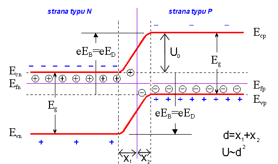 Předpokládejme, že jsme vytvořili PN přechod tak, že nalevo od počátku (pro záporná x) máme polovodič typu p a napravo od počátku polovodič typu n. Majoritními nosiči náboje v typu n jsou elektrony, v typu p díry. Vytvořením PN přechodu jsme vlastně vytvořili gradient koncentrace elektronů, který v bodě x=0 má vysokou kladnou hodnotu a gradient koncentrace děr, který v bodě x=0 má vysokou zápornou hodnotu. Ihned po vytvoření přechodu nastane tedy difuze děr z polovodiče typu p do polovodiče typu n a difuze elektronů z polovodiče typu n do polovodiče typu p. Jakmile se majoritní nosiče jednoho druhu dostanou do prostředí, kde jsou majoritními nosiči nosiče opačné polarity, prakticky okamžitě zrekombinují, tedy zaniknou z hlediska vedení proudu. Majoritní nosiče, které předifundovaly do polovodiče opačné vodivosti však odkryly náboj iontů příměsí, které jsou vázány v krystalové mřížce a nemohou se proto pohybovat. Např. díry, které předifundovaly z polovodiče typu p do polovodiče typu n, ”zanechaly” po sobě v polovodiči typu n nezkompenzovaný náboj záporných iontů třímocných příměsí a obdobně elektrony ”zanechaly” po sobě v polovodiči typu n nezkompenzovaný náboj kladných iontů pětimocných příměsí. Znamená to, že další a další difuze majoritních nosičů přes přechod se děje pod vlivem elektrického pole, neboť záporné ionty příměsí na straně polovodiče typu p působí svým přitažlivým elektrickým polem na difundující díry a obdobným efektem působí kladné ionty příměsí na straně polovodiče typu n na difundující elektrony. To má za následek, že po určité době se vytvoří rovnovážný stav a ten je právě charakterizován nedeformovanou Fermiho hladinou přes přechod PN. Je třeba si uvědomit, že celkový náboj v polovodiči zůstává zachován, tak že polovodič zůstává navenek elektricky neutrální, zmíněný přesun náboje probíhá jen v bezprostřední blízkosti přechodu PN. Kdybychom tedy připojili voltmetr na konce našeho jednorozměrného krystalu s PN přechodem, nenaměříme voltmetrem žádné napětí.