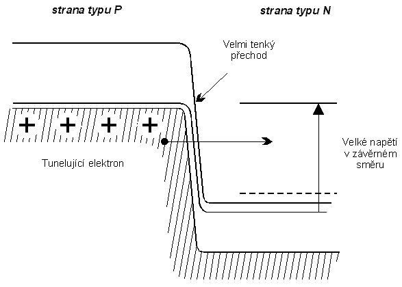 Při přiložení napětí na PN přechod v závěrném směru dochází ke zvýšení difuzní potenciálové bariéry a tím k dodatečné deformaci energetických pásů, jak je znázorněno na obrázku. Pokud je přechod dostatečně tenký, ”vidí” elektrony ve valenčním pásu na straně polovodiče typu P volné energetické hladiny ve vodivostním pásu na straně N a mohou tuto tenkou bariéru protunelovat (vysvětlení tunelového efektu podává jen kvantová fyzika; pomocí metod klasické mechaniky nelze tento efekt objasnit). Výsledkem je zvýšení zbytkového proudu diodou, na voltampérové charakteristice nerozeznatelné od zvýšení způsobeného lavinovým průrazem, viz obrázek 3.21.
