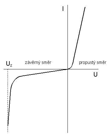 vypovídá, že v závěrném směru při dosažení dostatečně vysokého napětí, aby exponenciální člen zanikl ve srovnání s jedničkou, poteče diodou jen zbytkový proud a ten nebude na velikosti závěrného napětí záviset. Již jsme si vysvětlili princip tzv. lavinového průrazu, tj. generace párů elektron-díra urychlením elektrickým polem, které se přes přechod PN v závěrném směru vytvoří. Znamená to, že diodová rovnice, vzhledem k jednoduchým předpokladům jejího odvození, tento fyzikální efekt nepopisuje. Navíc existuje ještě jeden fyzikální princip, na jehož základě může docházet k průrazu přechodu PN při přiložení napětí v závěrném směru - tzv. Zenerův průraz. Vysvětlíme si tento efekt na základě obrázku 3.20.