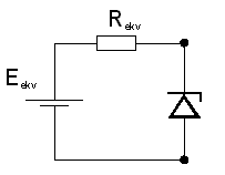 můžeme k analýze zapojení použít s výhodou Théveninovy věty, podle které nahradíme celý obvod až ke svorkám připojení diody. Vidíme, že obvod, který budeme nahrazovat, je vlastně jednoduchý odporový dělič a můžeme tedy okamžitě napsat pro ekvivalentní napětí a ekvivalentní odpor vztahy