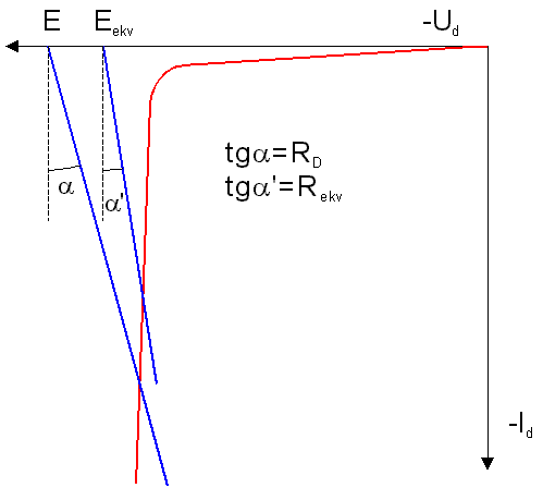 Směrnice zatěžovací přímky, tedy tangenta orientovaného úhlu mezi ní a osou pořadnic na charakteristice, je rovna záporně vzatému předřadnému odporu Rd. Zatěžovací přímku zkonstruujeme tak, že najdeme dva body, kterými musí procházet: pro nulový proud diodou je to bod (Ez,0), pro (myšleně) nulové napětí na diodě je to bod (0, Ez/Rd). Napětí na diodě a proud diodou musí vyhovovat jednak charakteristice, jednak zatěžovací přímce; to je možné jen v průsečíku obou čar. Při zvýšení napětí zdroje Ez na E1z>Ez se nezmění směrnice zatěžovací přímky a dostaneme ji tedy jako rovnoběžku k původní, procházející bodem (E1z,0) a obdobně při snížení napětí zdroje, jak je rovněž nakresleno na obrázku 3.23b. Vidíme, že díky strmosti charakteristiky diody v oblasti průrazu, je její diferenciální odpor malý a tedy i změna napětí na diodě bude relativně malá vzhledem ke změně napětí Ez. Definujeme zde tzv. činitel stabilizace