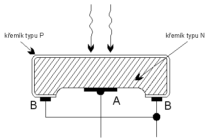 Nezaměnitelné místo mají speciální fotodiody, kterých se používá ke konverzi energie záření na energii elektrickou. Fyzikální princip funkce nejlépe vysvětlíme, představíme-li si fotodiodu nezapojenou do obvodu. Není-li ozářena, je vytvořena PN přechodem difuzní potenciálová bariéra vysoká tak, aby omezila proud majoritních nosičů na právě takovou velikost, aby proud majoritních nosičů každé polarity přes přechod PN byl právě kompenzován proudem minoritních nosičů stejné polarity přes přechod opačným směrem. Ozáříme-li nyní fotodiodu, zvýšíme koncentraci minoritních nosičů v polovodičích obou typů vodivostí a v důsledku toho stoupne proud minoritních nosičů přes PN přechod. Vzhledem k tomu, že jsme předpokládali diodu nezapojenou do obvodu, musí být celkový proud přes přechod roven nule právě tak jako v případě bez ozáření. To je možné jenom tak, že klesne potenciálová bariéra v blízkosti přechodu PN a umožní tak zvýšení proudu majoritních nosičů přes přechod. Krystal však tak přestává být v rovnováze, fermiho hladina se deformuje, a rozdíl mezi původní velikostí difuzního potenciálu a velikostí této bariéry po ozáření se objeví na svorkách diody jako napětí; na anodě fotodiody bude kladný pól a na katodě záporný pól. Uzavřeme-li nyní elektrický obvod tím, že k fotodiodě připojíme rezistor jako spotřebič, bude obvodem protékat elektrický proud - fotodioda bude fungovat jako sluneční článek. Na obrázku 3.24b je v levé části znázorněna zatěžovací přímka v tomto případě (napětí vnějšího zdroje je rovno nule, zatěžovací přímka vychází z počátku). Je vidět, že dioda jako zdroj má tím nižší diferenciální (vnitřní) odpor, čím vyšší je intenzita ozáření přechodu PN. Sluneční články se proto konstruují tak, viz obrázek 3.25,