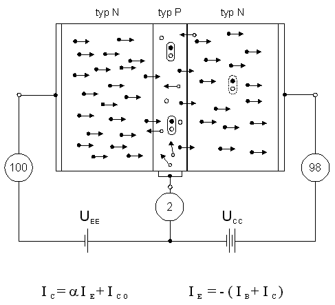 Díky pólování přechodu emitor-báze v propustném směru dochází injekci majoritních nosičů z emitoru do báze. Abychom nemuseli vždy opisovat oba případy (PNP i NPN), vybereme si k výkladu typ NPN. Elektrony jako majoritní nosiče v emitoru jsou tedy injekovány do báze a v blízkosti přechodu emitor-báze se tedy v bázi vytváří zvýšená koncentrace elektronů. Vzniká tedy gradient koncentrace elektronů v bázi tak, že směrem ke kolektorovému přechodu elektronů v bázi ubývá. Gradient koncentrace elektronů v bázi je důvodem pro difuzi elektronů skrz bázi směrem klesajícího gradientu, tedy směrem ke kolektorovému přechodu. Cestou skrz bázi řada elektronů zrekombinuje, neboť majoritními nosiči v bázi jsou díry a tedy pravděpodobnost rekombinace je vysoká, avšak vzhledem k tomu, že tloušťka báze je malá ve srovnání s difuzní délkou, velké procento elektronů se dostane do bezprostřední blízkosti přechodu báze-kolektor. Tento přechod je pólován v závěrném směru, ale pro majoritní nosiče v bázi, tedy díry. Elektrony, které prodifundovaly bází ke kolektorovému přechodu ”vidí” naopak potenciálový skok v urychlujícím směru a tak všechny elektrony, které se dostaly do blízkosti kolektorového přechodu (do oblasti dané šířkou přechodu báze-kolektor), budou tímto potenciálovým skokem vtaženy do kolektoru. Teče-li bází elektronový proud, je nutné do báze dodávat díry na rekombinaci těch elektronů, které v bázi rekombinují; tento děrový proud tedy tvoří proud báze. Vzhledem k tomu, že v bázi zrekombinuje jen malé procento z celkového proudu elektronů, je bázový proud malý ve srovnání s proudem, který teče cestou emitor-báze-kolektor. Kromě složky kolektorového proudu tvořené elektrony, které prošly bází od emitoru existuje ještě jedna složka a to závěrný proud kolektorové diody, tvořený minoritními nosiči v bázi a v kolektoru. Pro kolektorový proud můžeme tedy napsat rovnici, kterou nazýváme základní rovnicí tranzistoru