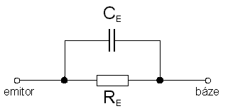 na kterém jsme si nahradili emitorový přechod tranzistoru paralelní kombinací odporu Re a kapacity Ce. Při diskusi o diodách s přechodem PN jsme si již ukázali, že kapacita přechodu je jeho inherentní vlastnost a není tedy možné vyrobit PN přechod s kapacitou rovnou nule. Proud Ie tekoucí do této kombinace zleva nám představuje proud, kterým v zapojení se společnou bází budíme tranzistor. Pouze složka Ier, která prochází rezistorem, představujícím činnou složku impedance emitorového přechodu bude tranzistorem zesílena, složka Iec, která prochází větví s kapacitou, zesílena nebude. Vyjádřeme si poměr Ier/Ie; ten nám bude představovat závislost koeficientu proudového zesílení v zapojení se společnou bází, a, na kmitočtu. Jest totiž, jak jsme konstatovali, koeficient a dán poměrem změny kolektorového proudu, dIk ke změně emitorového proudu, dIe, tj.