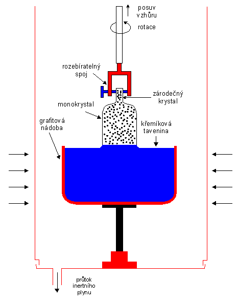 Představme si tedy, že máme vyrobit z purifikovaného křemíku ve formě drobných zrn monokrystalický materiál vhodný pro planární technologii. Metoda výroby tohoto materiálu (ingotu) je znázorněna na obrázku 4.1 a byla nazvána Czochralského (čti čochralského) metodou. Je to metoda pomalého tažení monokrystalického ingotu z taveniny výchozího materiálu, tedy křemíku. Křemík je umístěn v grafitové válcové nádobce v nádobě z křemenného skla. Křemenné sklo je voleno ze dvou důvodů; jednak vydrží velmi vysokou teplotu, jednak jsou v něm malé dielektrické ztráty. Válcová nádobka, ve které je křemík umístěn, je ohřívána na potřebnou teplotu pomocí tzv. indukčního ohřevu. K takovému ohřevu potřebujeme výkonový vysokofrekvenční generátor, s frekvencí typicky 500 kHz a výkonem několika kW. Energii z generátoru pak vedeme přes obvod přizpůsobující impedanci generátoru impedanci zátěže (vzpomeňte si například z úvodu; výkon dodaný ze zdroje do zátěže je maximální, má-li zátěž odpor stejný jako je vnitřní odpor zdroje; tento závěr se dá zobecnit na obecnou impedanci tak, že výkon do zátěže je maximální, jsou-li reálné složky vnitřní impedance zdroje a zátěže stejné a imaginární složky impedance zdroje a zátěže mají opačné znaménko) na primární vinutí vysokofrekvenčního transformátoru, které je navinuto zvnějšku válcové křemenné nádoby. Sekundár tohoto transformátoru tvoří grafitová nádobka, ve které je křemík umístěn. Při správném přizpůsobení dostaneme tak značnou část výkonu generátoru do tohoto sekundárního závitu (dielektrické ztráty v křemenném skle jsou malé, takže sklo se energií z generátoru přímo neohřívá; ohřívá se však radiací od grafitové nádobky) a to má za následek, že nádobku ohřejeme na teplotu potřebnou k roztavení křemíku. Vzhledem k tomu, že proces probíhá v inertní atmosféře, křemík se neoxiduje a je možné s ním pracovat ve stavu taveniny. Shora do nádobky s křemíkem zasahuje osa, na jejímž dolním konci je umístěn tzv. zárodečný krystal. Je to kus monokrystalického materiálu válcového tvaru s takovým průměrem, který chceme vyrábět. Konec zárodečného krystalu se nejprve ponoří do taveniny a pak se za pomalého otáčení z taveniny vytahuje. Výsledkem této činnosti je ingot křemíku válcovitého tvaru, ve kterém je relativně málo poruch krystalové mříže. Vytahováním ingotu z taveniny ubíráme ovšem materiál z grafitové nádobky, proto jej musíme přidávat; jeden z možných způsobů je přidávání materiálu do taveniny ve formě zrníček, pelet. Průměr monokrystalického ingotu rostl v průběhu vývoje s tím, jak se zlepšovalo ”know how” této metody; od cca jednoho centimetru v počátcích polovodičové éry až po dnešní ingoty s průměrem okolo 15-20 centimetrů. Je zřejmé, že během výroby těchto monokrystalických ingotů je možné do taveniny přidávat definované množství žádoucích příměsí, takže vytvořený monokrystalický materiál pak bude typu P nebo N.