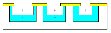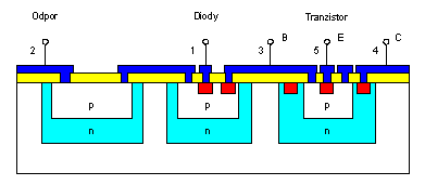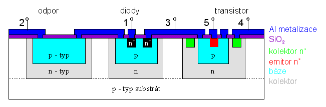 Izolované ostrůvky materiálu o vodivosti N tvoří v případě tranzistoru kolektor, pro diody a rezistor jen oblast, ve které budou později vytvořeny. Dalším technologickým krokem je tedy vytvoření oblastí vodivosti P v izolovaných ostrůvcích vodivosti N. Tyto oblasti budou sloužit jako rezistor, anody diod (anody jsou v případě našeho schematu propojeny, takže stačí vytvořit jen jednu oblast) a báze tranzistoru. Fotolitografickým procesem se opět vymezí oblasti, ve kterých se do materiálu o vodivosti N nadifunduje příměs typu P (třímocná) s takovou koncentrací, aby polovodič přešel kompenzovaným stavem a ”předopoval se” na vodivost P. Z hlediska rezistoru vidíme, že ten je tvořen přímo jen oblastí o vodivosti P určitého průřezu; právě průřezem oblasti je možné měnit velikost odporu budoucího rezistoru. Je zřejmé, že difusi příměsí musíme řídit tak, aby oblast typu P byla ”mělčí” než původní ostrůvek o vodivosti N.