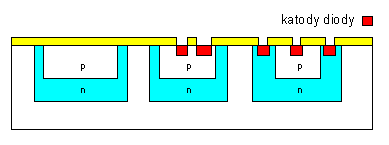 Po difuzi báze se povrch materiálu opět pokryje vrstvičkou SiO2 a opět fotolitografickým procesem se odkryjí ”okénka”, skrze něž se nadifundují katody diod, emitor tranzistoru a do kolektoru tranzistoru ”kontaktovací” oblasti. Zde je potřeba objasnit, co to ”kontaktovací oblasti” jsou. Přiložíme-li kovový vodič na polovodič s úmyslem vytvořit kontakt, může se nám stát, že to, co jsme považovali za kontakt bude vlastně Schottkyho dioda (dioda s přechodem kov-polovodič), tedy že voltampérová charakteristika spojení kov polovodič bude vykazovat usměrňující vlastnosti. To je ale pro kontakt nežádoucí efekt a obchází se tím, že při kontaktování na polovodič o vodivosti N vytvoříme v tomto polovodiči oblast se zvýšenou dotací příměsí typu N (označuje se N+; nezaměňujte, prosím, s iontem dusíku). Při kontaktování na polovodič typu P k usměrňovacímu efektu nedochází, neboť kontakt na polovodič se dělá hliníkem, což je vlastně příměs typu P, takže oblast zvýšené koncentrace příměsí pod kontaktem vznikne automaticky. Emitorová oblast tranzistoru se obvykle dotuje hodně a tak při stejném technologickém kroku můžeme do již vytvořených kolektorových oblastí typu N nadifundovat tuto oblast o zvýšené koncentraci příměsí, abychom usměrňovacímu efektu kontaktu předešli.