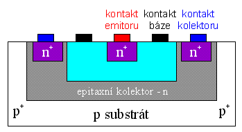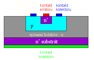 Při výrobě diskretních tranzistorů můžeme vynechat technologický krok izolace jednotlivých struktur na čipu, neboť na čipu bude vždy jen jedna struktura (dioda nebo tranzistor, odpory umíme dělat levněji a přesněji uhlíkovou nebo kovovou tenkou vrstvou na keramické tyčince, takže ty se z polovodičů nedělají; jedinou výjimkou jsou termistory, tj. odpory se záporným teplotním koeficientem odporu). Na obrázku 4.3, který je opět podle literatury [1] je vidět rozdíl mezi integrovaným a diskretním tranzistorem; diskretní tranzistor může mít kolektorový kontakt na druhé straně čipu, což u integrovaného tranzistoru není možné. Proto diskretní tranzistory (pokud jsou do kovového pouzdra zapouzdřeny) mívají kolektor spojený s kovovým pouzdrem.
