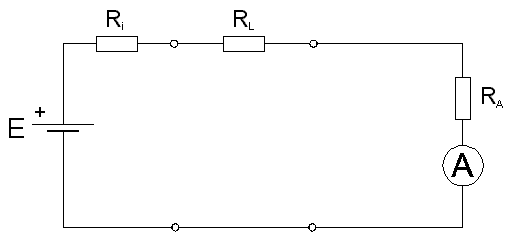 Zatím jsme se zabývali konstrukcí měřicího přístroje s deprézským systémem. Předpokládejme nyní, že máme k dispozici buď deprézský nebo jakýkoli jiný měřicí přístroj, známe jeho vnitřní odpory pro měření proudu a pro měření napětí a chceme určité měření provést. Je třeba si uvědomit, že každým měřením ovlivňujeme měřený obvod, že měřením vlastně měníme měřený obvod na obvod obsahující původní obvod a měřicí přístroj. Tato změna může v řadě případů způsobit jen malou chybu, ale v některých případech je třeba analýzu ovlivňování měřeného obvodu měřicím přístrojem provést. Předpokládejme nejprve měření proudu ampérmetrem s vnitřním odporem RA v jednoduchém obvodu složeném ze zdroje napětí E s vnitřním odporem Ri a jednoho rezistoru s odporem RL, viz obrázek 2.2.