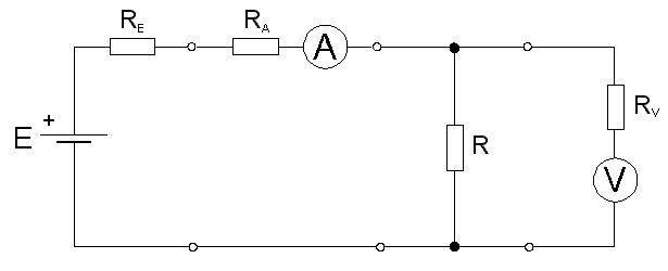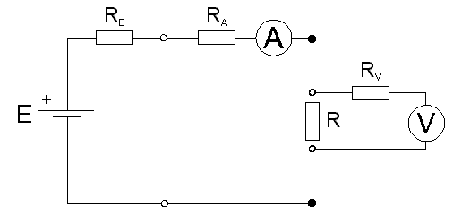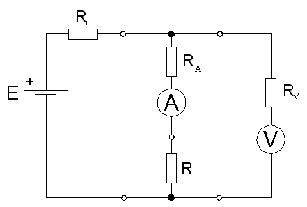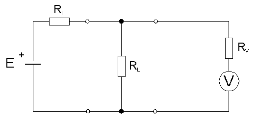 Podle Ohmova zákona je zřejmé, že proud protékající obvodem bude dán podílem napětí E a součtu všech tří odporů, I=E/(Ri+RL+RA). Nebude-li tedy RA « Ri + RL, naměříme jiný proud, než ten, který by protékal rezistorem s odporem RL bez připojeného ampérmetru. Mějme na paměti, že moderní digitální multimetry nejsou v tomto směru žádnou výjimkou, mají též svůj vnitřní odpor a též ovlivňují měřený obvod. Obdobně je tomu při měření napětí. Předpokládejme stejný měřený obvod, složený ze zdroje o napětí E a vnitřním odporu Ri, zapojeného na rezistor s odporem RL a předpokládejme nyní, že chceme změřit napětí na rezistoru RL voltmetrem s vnitřním odporem RV, viz obrázek 2.3.