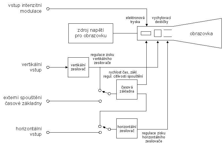 Blokové schéma osciloskopu vidíme na obrázku 2.6. Základní součástkou je obrazovka s elektrostatickým vychylováním elektronového paprsku. Elektrostatické vychylování je použito proto, aby bylo vychylování rychlé, současné špičkové analogové osciloskopy v tzv. reálném čase pracují do kmitočtu 1 GHz a vychylování paprsku to ”musí stihnout”. Nevýhodou elektrostatického vychylování oproti magnetickému, použitému např. v televizorech, je nutnost většího napětí na vychylovacích elektrodách a nemožnost tak velkého vychylovacího úhlu (u černobílých televizních obrazovek běžně 110° u barevných běžně 90°). Osciloskopické obrazovky jsou proto mnohem delší (vzhledem k velikosti stínítka) než televizní. Podobně jako televizní obrazovka potřebuje osciloskopická obrazovka žhavení katody, ostřicí elektrody a zdroj vysokého napětí na urychlení elektronového paprsku, aby po dopadu na luminofor, nanesený z vnitřní strany stínítka, vytvořil svítící stopu. Obrazovka osciloskopu má dva vychylovací systémy, pro osu x a pro osu y. Na oba tyto vychylovací systémy se přivádí zesílené napětí ze zesilovače pro osu x a pro osu y. Na vstup zesilovače pro osu x je navíc možné připojit vnitřní generátor lineárně vzrůstajícího napětí ve tvaru zubu pily, které pak může rozmítat elektronový paprsek podél osy x (zleva doprava, při zpětném běhu je elektronový paprsek zatemněn). Zesílení jak vertikálního zesilovače (pro osu y), tak horizontálního zesilovače (pro osu x) je možné měnit a navíc je možné měnit rychlost vzrůstu pilovitého napětí používaného na rozmítání v ose x a tak měnit časové měřítko rozmítání; proto se generátoru pilovitého napětí říká časová základna osciloskopu. Přivádíme-li na vertikální zesilovač řekněme sinusové napětí, musíme start generátoru pilovitého napětí synchronizovat tak, aby tento generátor startoval vždy v definované fázi sinusového signálu přiváděného na osu y; jinak neuvidíme na obrazovce osciloskopu sinusovku, ale mnoho sinusovek přeložených přes sebe, protože každý proběh časové základny zobrazí sinusovku přiloženého napětí s jinou počáteční fází. Výsledkem bez synchronizace časové základny je tedy zelený široký pruh na obrazovce, jehož výška je rovna dvojnásobné amplitudě sinusového signálu (to se někdy hodí, chceme-li např. právě tuto veličinu měřit, ale obvykle to je nežádoucí). Každý generátor časové základny osciloskopu má proto možnost přivedení synchronizačního napětí, tj. napětí, které může urychlit nebo opozdit start generátoru časové základny. Většina generátorů časové základny má rovněž možnost tzv. spouštění, tj. funkce, kdy generátor časové základny čeká na to, až napětí na synchronizačním vstupu dosáhne určité (na předním panelu osciloskopu nastavitelné) úrovně a pak teprve spustí generaci pilovitého napětí. Režim synchronizace se obvykle na panelu osciloskopu označuje jako ”Auto”, režim spouštění jako ”Norm”. Snadno poznáte, ve kterém režimu osciloskop pracuje, když odejmete synchronizační signál; v režimu ”Auto” zůstane na obrazovce stopa paprsku, v režimu ”Norm” stopa zmizí, protože generátor časové základny čeká na spouštěcí signál. Synchronizační signál je možné brát (volí se přepínačem na panelu osciloskopu) buď ze zobrazovaného signálu, to je tzv. vnitřní synchronizace, nebo je možné na zvláštní vstup osciloskopu, označený jako Ext. trigger, přivést vhodné synchronizační napětí. Přepínač mezi těmito dvěma módy má obvykle ještě dvě polohy, jednu pro synchronizaci síťovým kmitočtem (line) a druhou pro přepnutí na provoz x-y, tj. s odpojenou časovou základnou. V tomto režimu je např. možné vyzkoušet si tvorbu Lissajousových obrazců.
