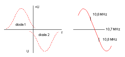 Jednoduchý rezonanční obvod, jaký je ukázán na obrázku 6.4. není v praxi užíván z důvodů nelinearity, tj. nelineární závislosti výstupní amplitudy na kmitočtu. Kombinace dvou rezonančních obvodů, jednoho naladěného ”pod” nosný kmitočet a jednoho naladěného ”nad” něj, které jsou napájeny napětím kmitočtově modulované nosné vlny v navzájem opačné fázi kompenzuje nelinearitu ”paty” rezonanční křivky, takže závislost výstupní amplitudy na frekvenci je v relativně širokém rozsahu lineární, viz obrázek 6.5.