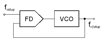 Blokové schema fázového závěsu je velmi jednoduché. Skládá se z generátoru, jehož kmitočet je řízen napětím (VCO jak jsme již měli výše) a z fázového detektoru, jehož výstupem je napětí přivedené na vstup VCO pro řízení frekvence. Fázový detektor určuje v nejjednodušším případě rozdíl fáze mezi vstupním kmitočtem, s jehož frekvencí chceme synchronizovat kmitočet VCO, a výstupním signálem z VCO. Toto základní blokové schema je uvedeno na obrázku 6.6.
