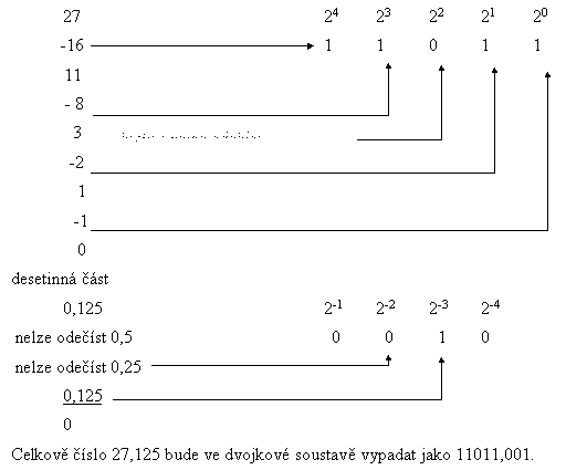 Příklad: Máme převést dekadické číslo 27,125 na jeho dvojkový ekvivalent. Číslo rozdělíme na celočíselnou a desetinou část 27 + 0,125 a aplikujeme právě popsaný postup: