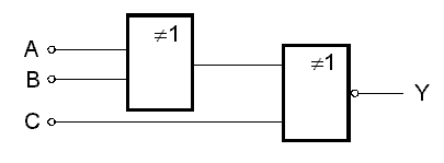 Funkci Y tedy reprezentují dvě hradla EXCLUSIVE-OR zapojená v kaskádě jak je ukázáno na obr. 7.25.b. Funkce Y je též příkladem kombinačního logického systému.