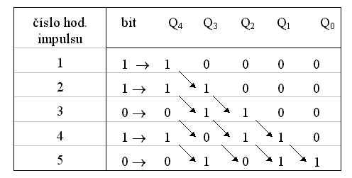 významného (LSB). Při prvním hodinovém impulsu je tedy na vstupu registru (KO4) nejméně významný bit, který se úběžnou hranou impulsu
