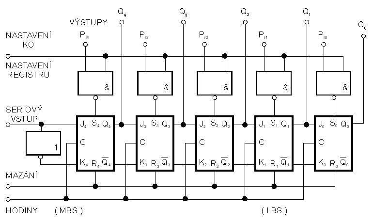 Kombinací n klopných obvodů, schopnou zapamatovat si n-bitovou informaci, nazýváme registrem. Spojíme-li výstup klopného obvodu se vstupem následujícího klopného obvodu etc., dostáváme sestavu tzv. posuvného registru. Příklad pětibitového posuvného registru, který je komerčně vyráběn, vidíme na obr. 7.30. Pro posuvný registr jsou nezbytné dvojčinné obvody typu J-K. Pokud je posuvný registr vybaven sériovým vstupem dat (viz obr. 7.30), je první klopný obvod opatřen invertorem mezi vstupy J a K , čímž je vytvořen z tohoto klopného obvodu klopný obvod typu D. Hradla typu NAND v nastavovacích vstupech klopných obvodů slouží k tomu, aby se všech pět klopných obvodů po nastavení informace na jednotlivých vstupech PS0 - PS4 mohlo nastavit jediným impulsem.