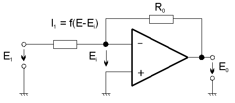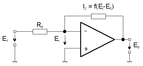 Výstupní napětí u funkčních měničů není přímo úměrné, případně lineárně závislé na vstupním signálu, ale je jeho nelineární funkcí. Funkční měnič si můžeme pomocí operačního zesilovače realizovat pomocí nelineárního prvku v roli vstupního odporu obr. 5.5. Pak: