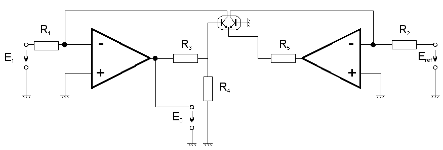 Zapojení na obr. 5.7a,b mají nevýhodu v silné tepelné závislosti jejich zesilovací charakteristiky. Ta je způsobena závislostí zbytkového proudu a tepelného napětí na teplotě. Při změně teploty PN přechodu ze 20° C na 50° C se u tranzistoru zbytkový proud změní přibližně o řád a tepelné napětí asi o 10 %. Z těchto důvodů se používají různá kompenzační zapojení. Příklad kompenzačního zapojení logaritmujícího zesilovače je uveden na obr. 5.8.