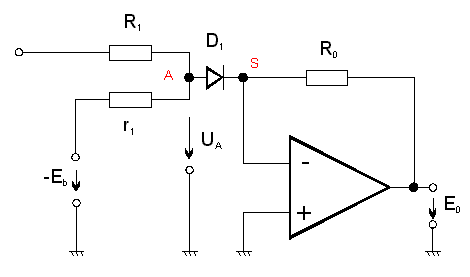 Sumační bod je na potenciálu virtuální nuly. Diodou D1 teče proto proud pouze v těch případech, pro které je napětí v bodě A kladné.