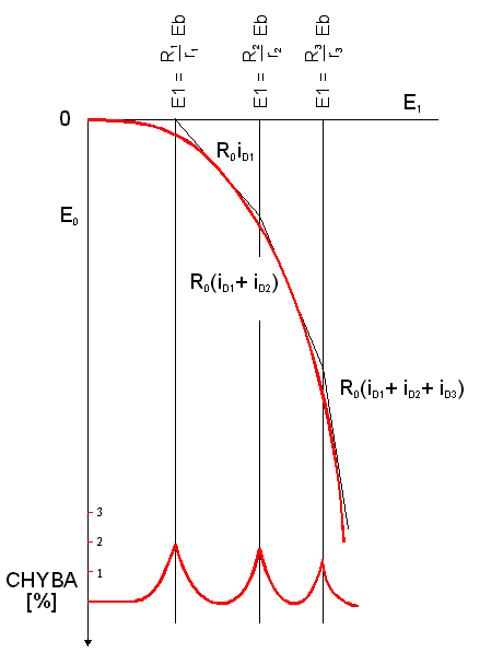 Na obr. 5.11 je znázorněna zesilující charakteristika zesilovače vytvořeného ze tří základních diodových prvků s diskrétně rozloženými body zlomu. Z obrázku je patrno, že funkční křivku nahrazujeme lomenou čárou a že chyba funkčního převodu závisí na vstupním napětí. Největší chyba je v bodech zlomu.