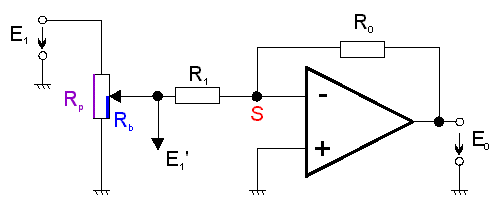 K násobení napětí konstantním koeficientem a se používá jednoduchý počítačový prvek - potenciometr. Přesné potenciometry jsou zpravidla víceotáčkové a jsou opatřeny stupnicí, která udává relativní úhel otočení, tj. úměrnou část z celkové hodnoty odporu potenciometru. Potenciometr je obvykle zatížen vstupním odporem R1 zesilovače (například invertujícího, viz.obr.5.20). Poměr a s představuje koeficient na stupnici (údaj stupnice) potenciometru: