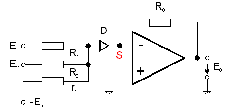 Sčítací kvadrátor je založen na stejném principu jako diodový funkční měnič jednoho analogového signálu; pouze napětí na jeho vstupu je vytvořeno součtem několika vstupních signálů. Základní diodový obvod pro sčítací diodový měnič dvou analogových napětí ekvivalentní obvodu z obr.5.9 je uveden na obr.5.22.