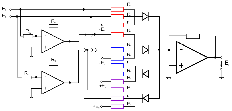 Obdobně jako pro jedno analogové napětí je sčítací funkční měnič vytvořen souborem základních diodových sčítacích obvodů s diskrétně rozloženými body zlomu. Lomená charakteristika je volena tak, aby aproximovala kvadratickou funkci. Analogovou násobičku dvou vstupních napětí E1 a E2 pro všechny kombinace jejich znaménka,tzv. čtyřkvadrantovou násobičku,lze sestavit ze čtyř sčítacích kvadrátorů podle obr. 5.23. Na obr. 5.23 je pro přehlednost nakresleny pro každý kvadrátor pouze jeden základní obvod.