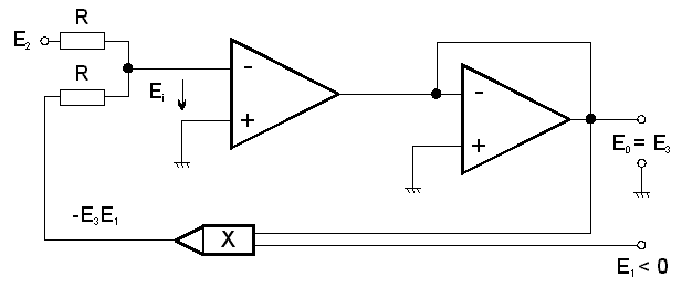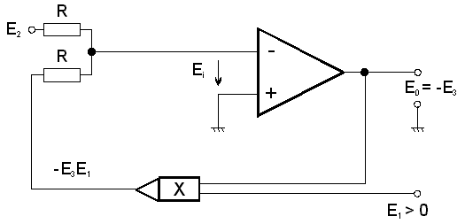 Zapojíme-li diodovou násobičku do obvodu zpětné vazby operačního zesilovače podle obr. 5.24, můžeme ji využít i pro dělení dvou proměnných. Využíváme při tom implicitní metodu výpočtu. Považujeme-li vstupní napětí operačního zesilovače Ei za zanedbatelné, musí se jeho výstupní napětí nastavit na takovou hodnotu, pro kterou platí