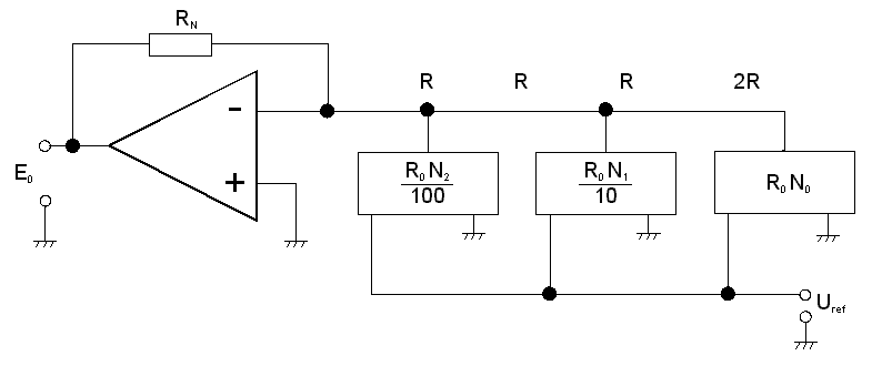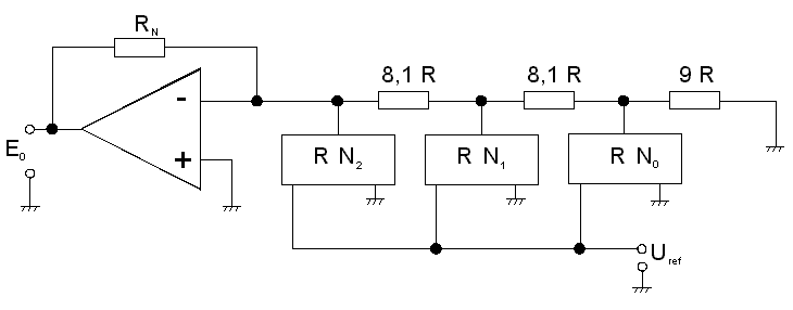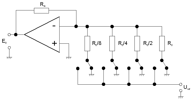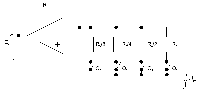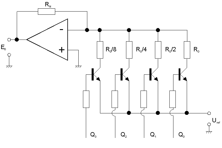 Jako spínačů se používá obvykle tranzistorů v inverzním zapojení tak, aby chyba způsobená saturačním napětím byla co nejmenší. U inverzního zapojení je saturační napětí řádu mV takže při referenčním napětí Uref = 10 V je chyba způsobená saturačním napětím řádu jednotky promile. Příklad zapojení je na obr. 8.2