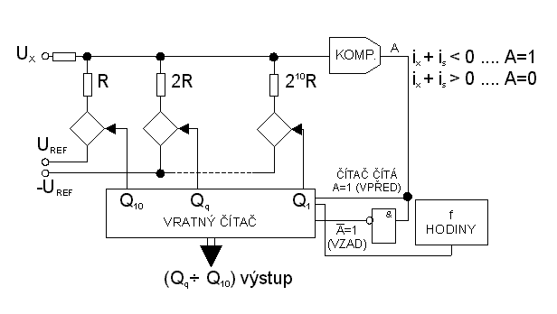 Převáděné napětí Ux je přivedeno na komparátor, kde se srovnává s výstupním napětím převodníku D/A. Převodník D/A je řízen vratným čítačem (viz. obr. 5.38) jehož směr čítání je řízen komparátorem. Čítač čítá hodinové impulsy vpřed v případě, že pro proud ix = (Ux/R) a pro proud ze sítě převodníku D/A is platí vztah