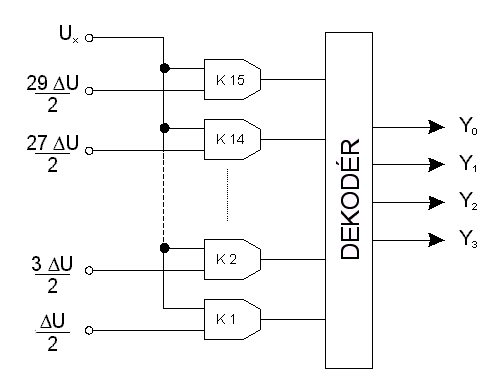 Jako další příklad komparačního převodníku si uvedeme paralelní převodník. Jeho základem je 2j -1 komparátorů. Na jedny vstupy komparátorů přivádíme převáděné napětí Ux .Na druhé vstupy přivádíme násobky napětí Uref tak, že rozdělíme Uref na 2j diskretních hladin o stálém napětovém rozdílu mezi hladinami DU = (Uref/2j). Jestliže napěťovou úroveň první nenulové hladiny posuneme na DU/2 pak výstup prvního komparátoru se změní z log 0 na log 1 v případě, že Ux > DU/2. Výstup druhého komparátoru se změní pro Ux > (3 DU/2) atd. Výstupy komparátorů vedeme na dekodér pomocí něhož každému napěťovému intervalu mezi dvěma hladinami přiřadíme binární číslo. Napětí Ux můžeme pak vyjádřit tímto číslem:
