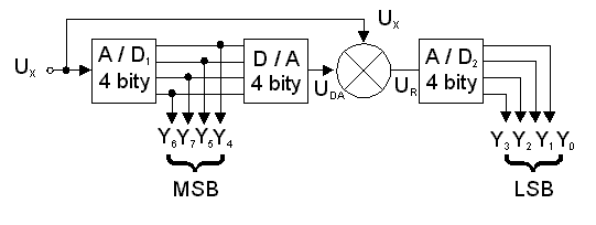 Principielní zapojení pro j =8 je na obr. 8.12. Převáděné napětí Ux je nejprve přivedeno na první čtyřbitový převodník pomocí něhož získáme první čtyři bity (MSB). Tyto čtyři bity vedeme na D/A čtyřbitový převodník pomocí něhož dostaneme napětí UDA. Napětí UR = Ux - UDA je opět digitalizováno dalším čtyřbitovým převodníkem, čímž získáme další čtyři bity (LSB). Jinými slovy, prvním A/D převodníkem rozdělíme referenční napětí na 16 diskretních napěťových intervalů, které dalším A/D převodníkem rozdělíme do dalších 16 napěťových intervalů. Počet komparátorů v A/D převodnících tedy klesne pro j = 8 z 255 na 30 .Tato úspora se ovšem dosáhne za cenu prodloužení časového intervalu převodu. Přesto jsou seriově-paralelní A/D převodníky rychlé a např. u 8bitových převodníků může doba potřebná k převodu dosáhnout hodnoty řádově stovky nsec .
