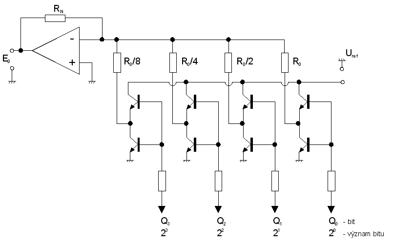 Číslicově analogové převodníky neboli převodníky číslo-napětí (zkráceně převodník Č/N nebo D/A) zabezpečují transformaci informace vyjádřenou v číslicové formě na analogové napětí. U D/A převodníku využíváme vlastnosti operačního zesilovače u kterého je zesílení prakticky určeno zpětnou vazbou. Principielní zapojení čtyřbitového převodníku je na obr.8.1