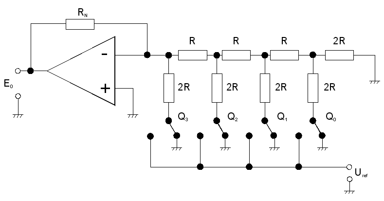 Zapojení uvedené na obr. 8.1 a 8.2 mají nevýhodu v tom, že odpor sítě se mění v závislosti na vstupním čísle (Q3, Q2, Q1, Q0). U reálného operačního zesilovače tak může vzniknout chyba ve výstupním napětí způsobená změnou vstupního proudu. Aby odpor sítě byl nezávislý na vstupním čísle, je zapojení modifikováno podle obr. 8.3.