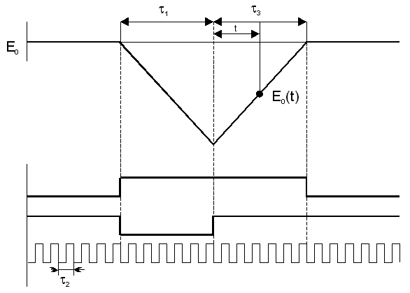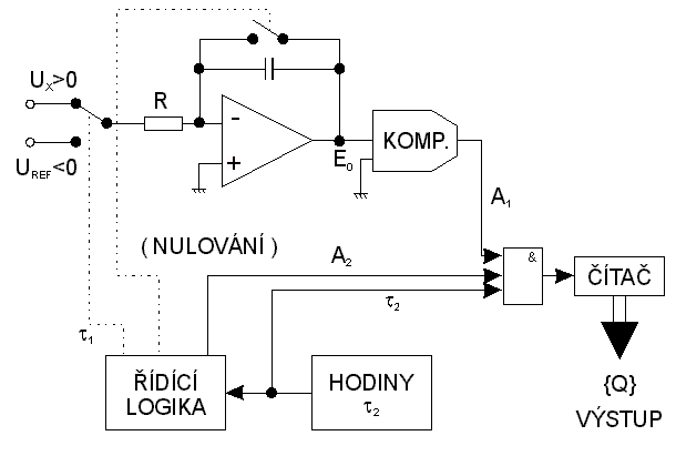 Tento převodník je typickým představitelem převodníku kde se analogový signál transformuje na časový interval, který se digitalizuje. Základním obvodem je analogový integrátor (obr. 8.8). Ke vstupu integrátoru se nejprve na přesně stanovený časový interval t 1 přivede analogový signál Ux > 0. Poté se na vstup integrátoru připne referenční napětí Uref opačného znaménka než Ux. Komparátor určuje okamžik, kdy výstupní napětí integrátoru je rovno nule. Časový interval mezi okamžikem připojení napětí Uref na vstup integrátoru a překlopení komparátoru označíme t 3. Časové intervaly t 1 a t 3 měříme jako násobky přesného hodinového intervalu t 2 .