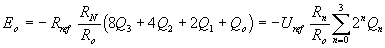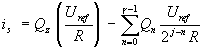 Bit s nejvyšší vahou u převodníku D/A má význam znaménkového bitu. Je připojen na kladné referenční napětí (+Uref ). Ostatni bity jsou připojeny na záporné referenční napětí. Proud ze sítě převodníku D/A pak můžeme vyjádřit vztahem: