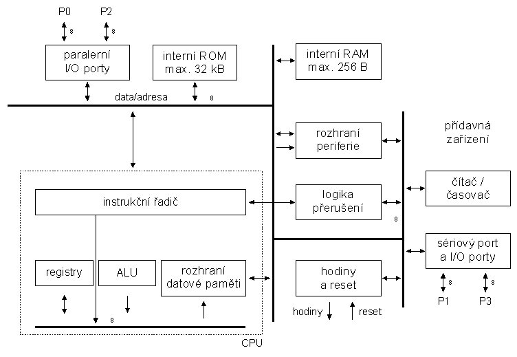 Řada Intel MCS-51 (integrováno na čipu) 8bitová CPU 4/8 kB ROM 128/256 bytů RAM 2 čítače/časovače paralelní vstup/výstup seriový vstup/výstup až 6 zdrojů přerušení |