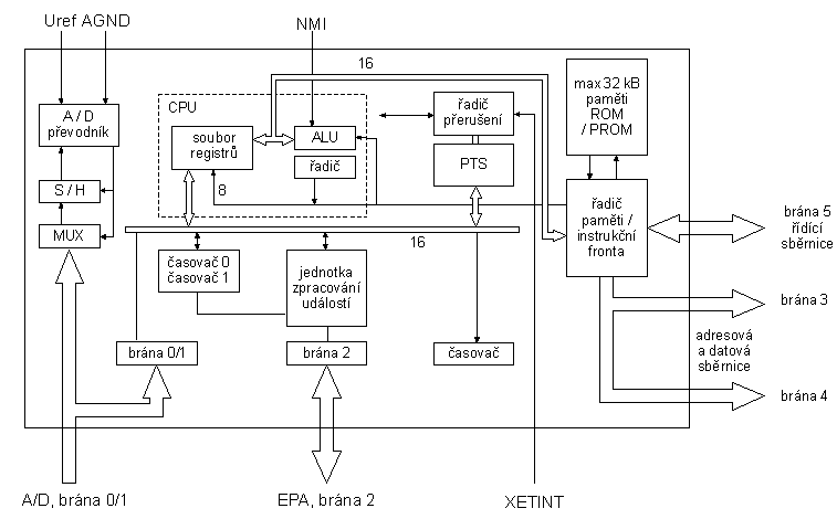 Řada Intel MCS-96 (integrováno na čipu) 16bitová CPU až 32kB ROM až 744 bytů RAM 2 čítače/časovače a hlídací časovač (watchdog) až 64 bitů číslicových vstupů/výstupů až 5 seriových linek vstupu/výstupu A/D převodník 8/10 bitů s multiplexerem jednotka zpracování událostí jednotka zrychlené obsluhy přerušení až 14 zdrojů přerušení |